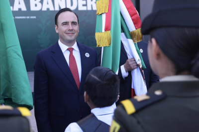 Desde Torreón, el gobernador Manolo Jiménez Salinas, junto al general Fernando Colchado Gómez, comandante de la XI Región Militar; el alcalde Román Alberto Cepeda González, así como mandos militares, autoridades estatales y municipales, conmemoraron el Día de la Bandera, en donde reiteró su compromiso de seguir trabajando con voluntad y coordinación por el bien de Coahuila y de México.