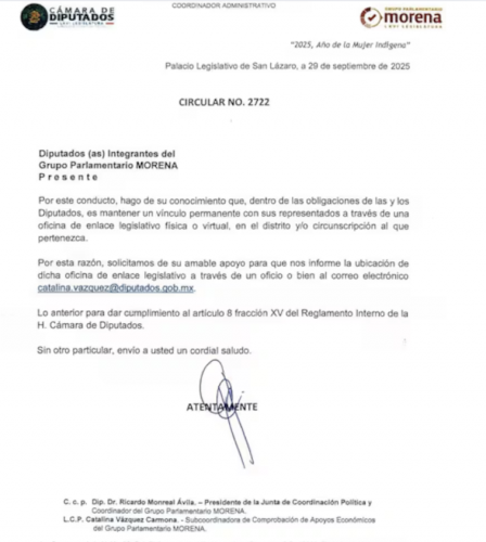 “Por este conducto, hago de su conocimiento que, dentro de las obligaciones de las y los diputados es mantener un vínculo permanente con sus representados a través de una oficina de enlace legislativo física o virtual, en el distrito y/o circunscripción al que pertenezca”, se lee en el documento revelado por El Universal.