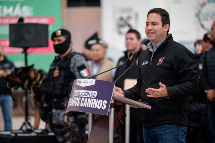 El alcalde de Saltillo, Javier Díaz González encabezó la ceremonia en la que de manera simbólica “César” y “Bebeto”, dos elementos de la unidad canina K9, concluyeron su labor de años de servicio al interior de la Comisaría de Seguridad y Protección Ciudadana.