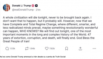 «Una civilización entera morirá esta noche, para no volver jamás. No quiero que suceda, pero probablemente ocurrirá», escribió Trump en su plataforma Truth Social. «¿quién sabe?», agregó.