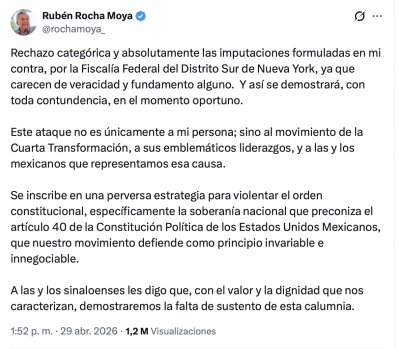 “Los acusados son todos funcionarios de alto rango, actuales o anteriores, del gobierno y las fuerzas del orden del estado mexicano de Sinaloa, incluido el actual gobernador de Sinaloa, Rubén Rocha Moya, y se les acusa de haberse asociado con el Cártel de Sinaloa para distribuir grandes cantidades de narcóticos a Estados Unidos. El caso está asignado a la jueza federal Katherine Polk Failla», apuntó el Departamento de Justicia estadounidense en un comunicado este miércoles 29 de abril.