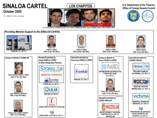 La Oficina de Control de Activos Extranjeros (OFAC, por sus siglas en inglés), del Departamento del Tesoro de Estados Unidos (USTR), sancionó, el 6 de octubre de 2025, a ocho personas y doce empresas mexicanas -la mayoría de ellas sinaloenses-, afiliadas a “Los Chapitos” y/o “Los Menores” y/o “Los Chiquillos”, una facción del Cártel de Sinaloa que lideran Iván Archivaldo Guzmán Salazar, “El Chapito”, y a sus hermanos, Jesús Alfredo Guzmán Salazar, alias “El Güero Moreno” y/o “El Alfredillo”, así como a Joaquín y Ovidio Guzmán López, “El Ratón”, todos hijos del capo sinaloense Joaquín Archivaldo Guzmán Loera, “El Chapo”, estos últimos presos en Estados Unidos.