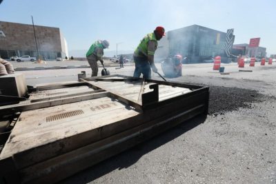 Asimismo, por medio de maquinaria moderna a base de calor, el Ayuntamiento intensifica los trabajos de rehabilitación de distintos puntos del bulevar Venustiano Carranza, al norte de la ciudad.