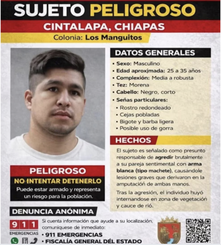 La Fiscalía General del Estado de Chiapas emitió una orden de aprehensión contra Pablo Ruiz Córdova por el delito de feminicidio en grado de tentativa y formalizó una recompensa de 500 mil pesos para quien proporcione información que lleve a su localización.