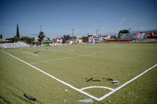 Asimismo, están muy avanzados los trabajos para la colocación de pasto sintético en la cancha de fútbol que está anexa al Centro Comunitario de la colonia Gustavo Espinoza Mireles, espacio deportivo que durante muchos años tuvo una superficie de tierra.