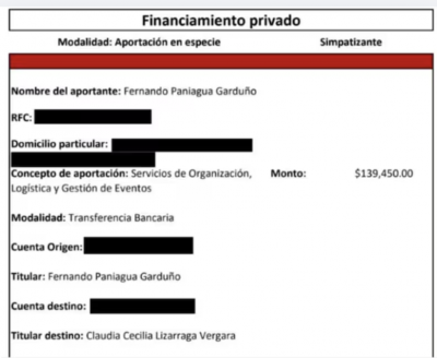 El medio accedió a uno de los comprobantes de pago realizado a la campaña correspondiente a Fernando Paniagua Garduño, socio del líder de la Barredora en la empresa Inmobiliaria y Constructora Samaria, empresa que fundaron el 20 de julio del 2000 en Villahermosa.