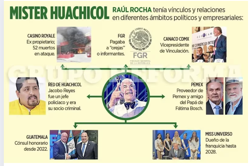 Una investigación de la Fiscalía General de la República (FGR)reveló los presuntos vínculos del copropietario de la franquicia Miss Universo, Raúl Rocha Cantú y su cómplice Jacobo Reyes León “El Yaicob” y con el clan de Los Farías, una célula del Cártel de Sinaloa con presencia en Campeche y la frontera con Guatemala.