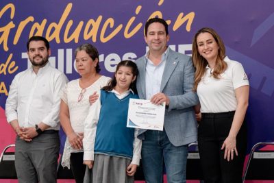 Saltillo, Coahuila de Zaragoza; 25 de marzo de 2026.- El alcalde Javier Díaz González y su esposa Luly López Naranjo, presidenta honoraria del DIF Saltillo, encabezaron la graduación de 506 alumnos que participaron durante el primer trimestre del año en los talleres “Amor por Aprender”.