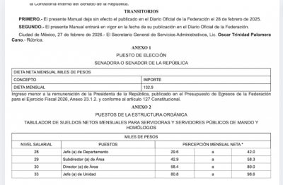 Este 27 de febrero se publicó un nuevo decreto para el Manual de Remuneraciones de las y los senadores y mando homologados, en el que aumentan su sueldo mil 200 pesos, pasando a 132 mil 900 pesos mensuales. Anteriormente, los legisladores tenían como dieta neta mensual 131 mil 700 pesos.