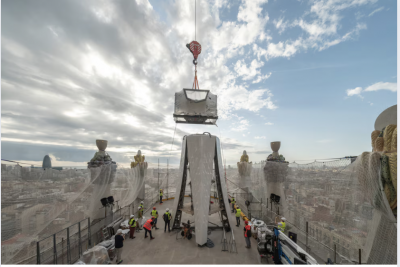 Al recibir las piezas, fueron trasladas a 54 metros de altura, donde se encuentran las cubiertas en lo alto de la Basílica. Allí, los equipos técnicos procedieron al ensamblaje, la colocación de vidrios y los ajustes internos necesarios. Un procedimiento especialmente complicado, teniendo en cuenta que “cada pieza tiene un peso aproximado de 12,8 toneladas y mide 4,40 m x 4,50 m x 4,50 m”, siguiendo la geometría de doble giro característica de las columnas y cruces diseñadas por Gaudí en el Àlbums de Temple.