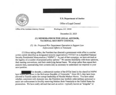 Un memorando confidencial del Departamento de Justicia de Estados Unidos, fechado el 23 de diciembre de 2025 -11 días antes del operativo en Caracas- y dirigido al Consejo de Seguridad Nacional de los Estados Unidos (NSC), concluyó que el presidente estadounidense podía autorizar una operación militar limitada para capturar a Nicolás Maduro en Venezuela, siempre que se cumplieran determinadas condiciones. El informe determinó que esta acción no violaría la Constitución ni el derecho internacional.