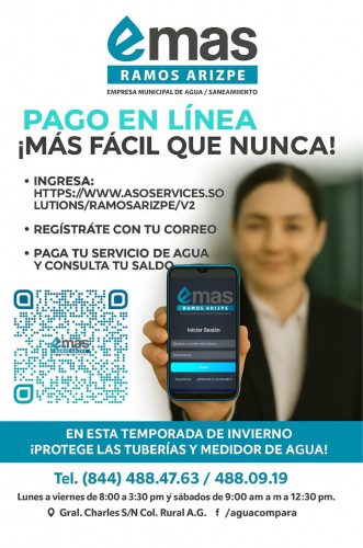 El Gobierno Municipal de Ramos Arizpe informa que, a través de la Empresa Municipal de Agua y Saneamiento (EMAS), se pondrá en operación una nueva plataforma digital para el pago en línea y consulta de saldo, con el objetivo de facilitar los trámites y mejorar la atención a los usuarios del servicio de agua potable.