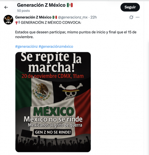 La publicación difundida en la red social X planteó una concentración para este 20 de noviembre alrededor de las 11:00 horas. El colectivo señaló que el objetivo principal es exigir justicia y seguridad en el país, en respuesta a una ola de violencia que se agravó tras el asesinato de Carlos Manzo, alcalde de Uruapan, Michoacán.