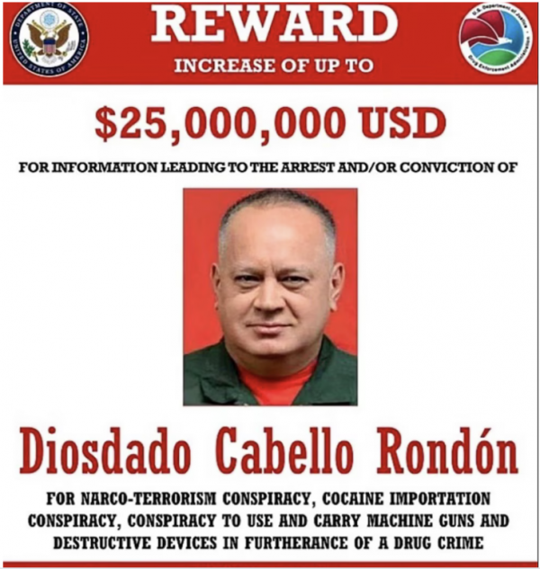 Desde entonces, las autoridades norteamericanas han elevado la recompensa a 25 millones de dólares. Cabello ha negado públicamente cualquier vínculo con el narcotráfico.