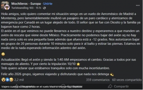 A través de un grupo de Facebook, un usuario cuya identificación no fue dada a conocer, reveló todo lo que se vivió esa mañana en el vuelo Madrid-Monterrey, donde fueron enviados de emergencia a la Base Aérea de Goose Bay.